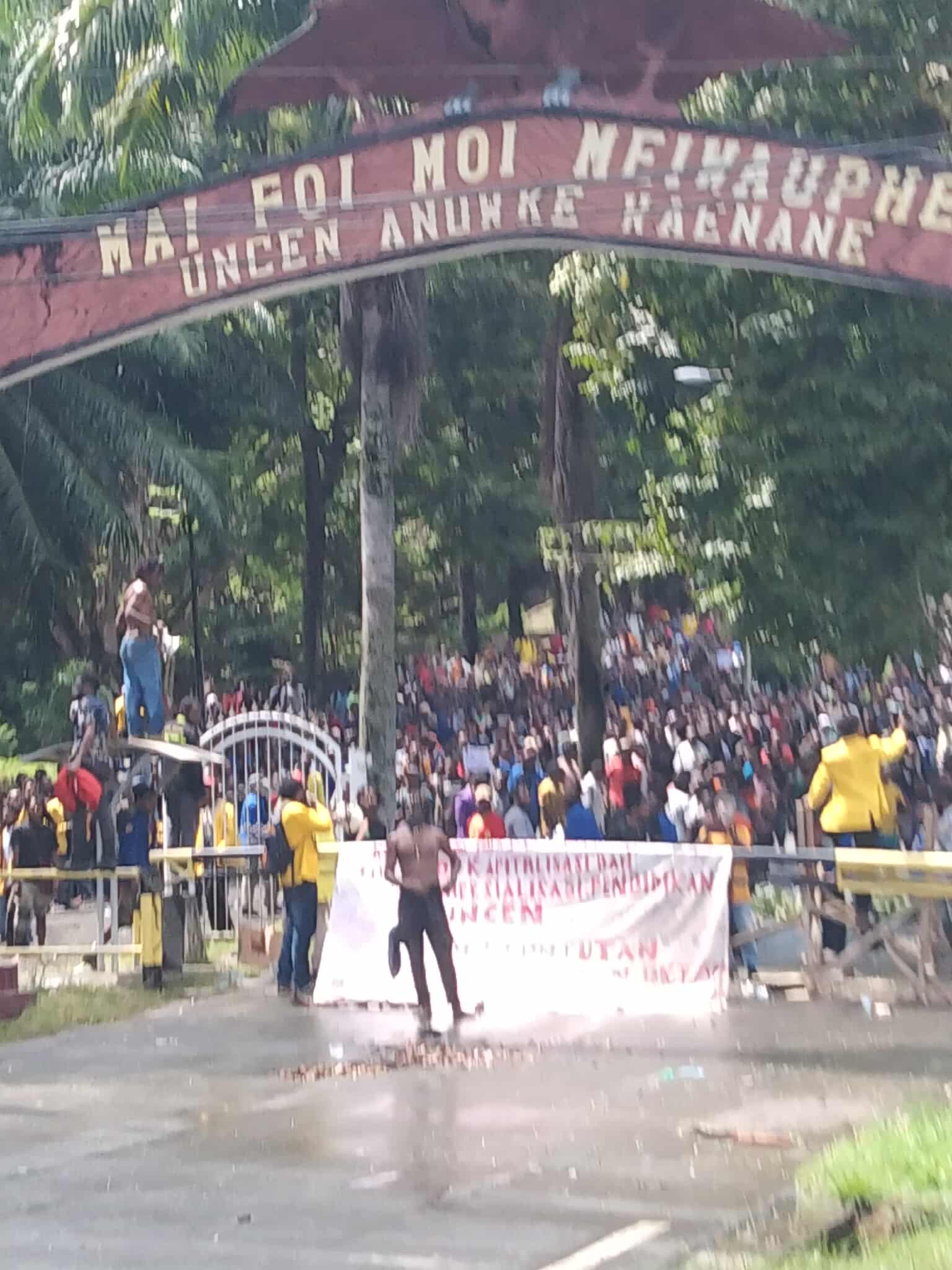 Mahasiswa yang menuntut penurunan Uang Kuliah Tunggal (UKT) dan biaya kuliah setiap semester dibubarkan secara paksa oleh aparat kepolisian. Kericuhan pecah di halaman Kampus Uncen Baru, Waena, setelah aparat menembakkan gas air mata dan menyemprotkan water cannon ke arah massa.