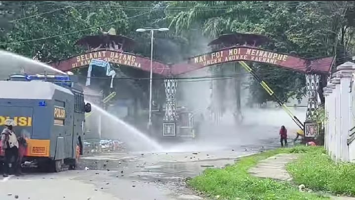 Aksi yang mulanya berlangsung damai berubah tegang sekitar pukul 10.26 WIT, ketika aparat mulai menyemprotkan water cannon ke arah massa yang menutup gerbang masuk kampus. Mahasiswa merespons dengan melempari aparat menggunakan batu.