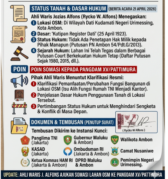 Ahli waris Jozias Alfons menjadi pihak yang paling keras menyuarakan keberatan. Melalui surat resmi tertanggal 21 April 2026, mereka mendesak Pangdam XV/Pattimura untuk membuka secara transparan dasar hukum dari rencana pengalihan bangunan yang selama ini ditempati anggota TNI menjadi fasilitas perkantoran.