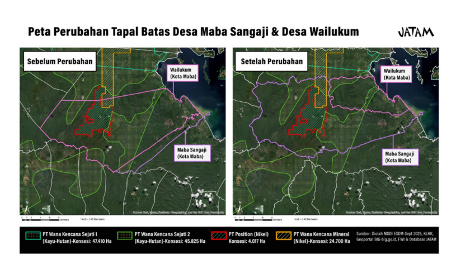 Perubahan batas wilayah antara Desa Maba Sangaji dan Desa Wailukum secara tiba-tiba dijadikan dasar untuk melegitimasi perluasan konsesi tambang di wilayah adat Moronopo — ruang hidup penting bagi masyarakat adat Teluk Buli. Dokumen batas baru muncul tanpa sosialisasi publik, namun langsung masuk ke dalam peta izin pertambangan, memiskinkan warga dari proses partisipasi.