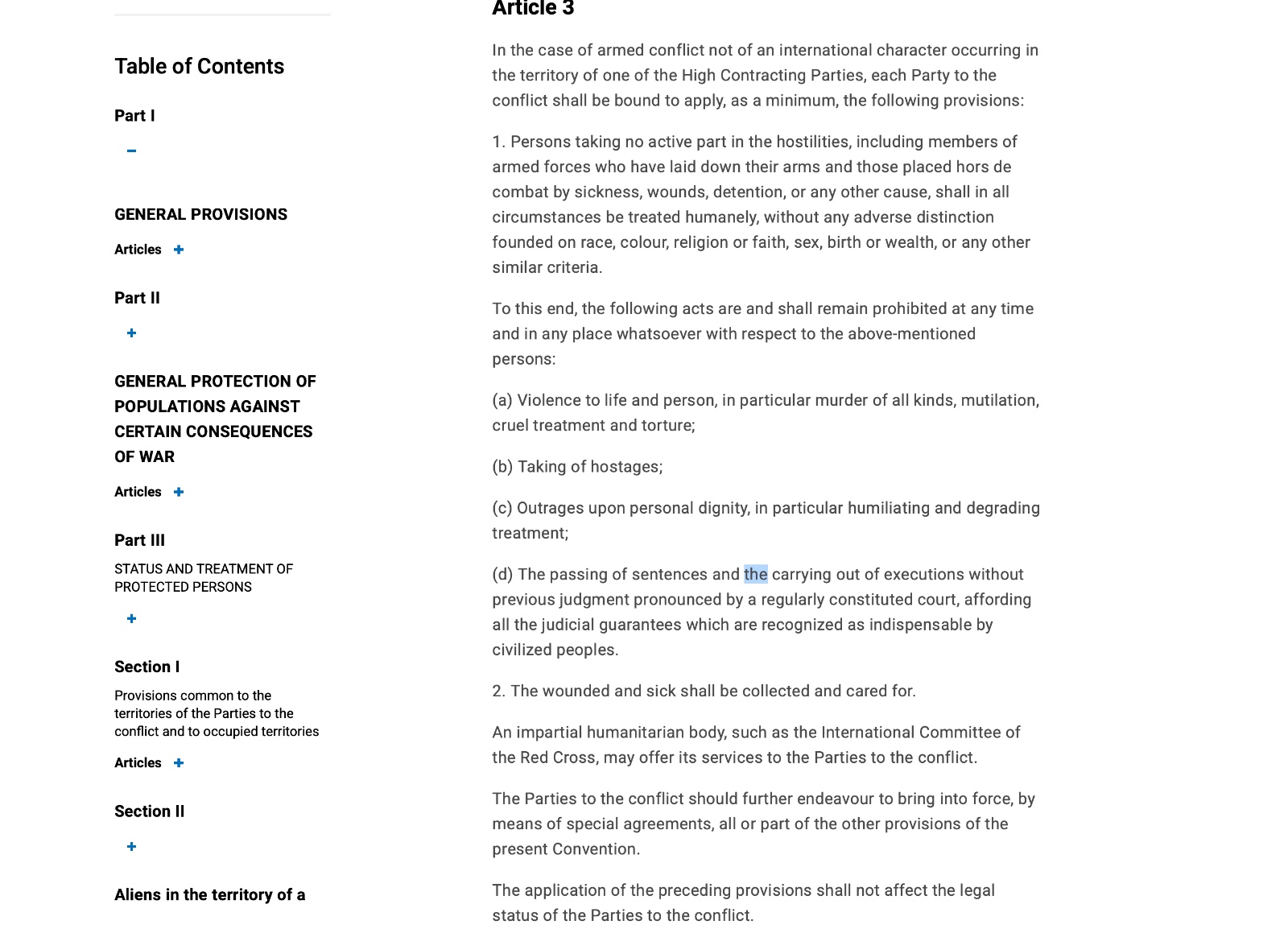 Ia menegaskan, Pasal 3 Konvensi Jenewa menuntut perlakuan manusiawi terhadap semua pihak yang tidak ikut serta dalam pertempuran. Larangan eksplisit di dalamnya meliputi: