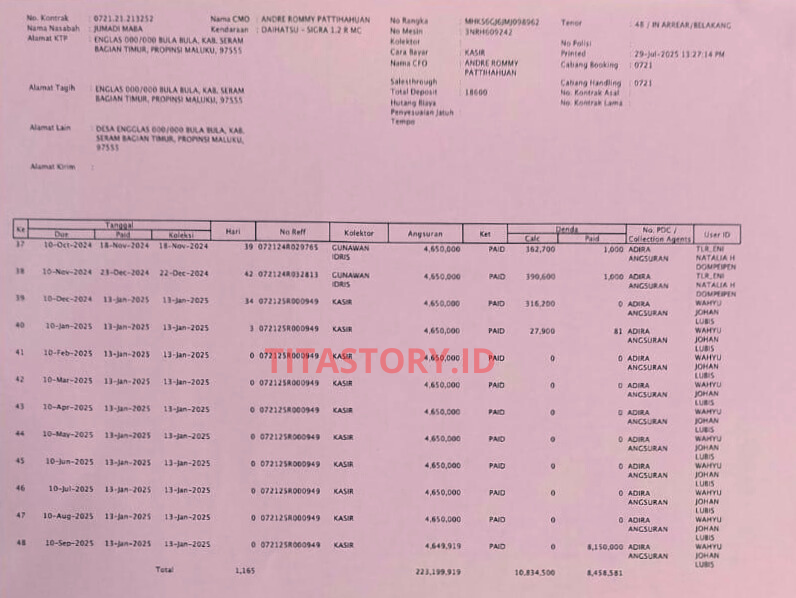 Tim titastory.id juga memperoleh informasi tambahan terkait dugaan penggunaan dana desa untuk kepentingan pribadi. Diketahui terdapat transaksi mencurigakan atas nama Jumadi Maba berupa pembayaran angsuran mobil Daihatsu Sigra selama 9 bulan sekaligus, dari Januari hingga September 2024. Total angsuran mencapai Rp48,5 juta dan diduga tidak sejalan dengan penghasilan resmi kepala desa.