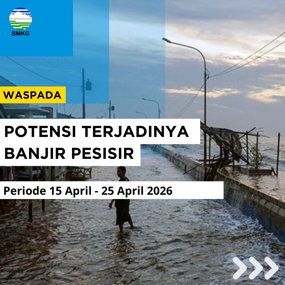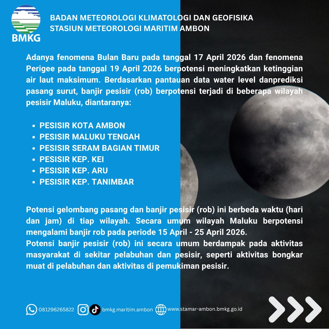 Ambon,-Badan Meteorologi, Klimatologi, dan Geofisika (BMKG) melalui Stasiun Maritim Ambon mengeluarkan peringatan dini terkait potensi banjir pesisir (rob) yang diperkirakan melanda sejumlah wilayah di Maluku dalam periode 15 hingga 25 April 2026.